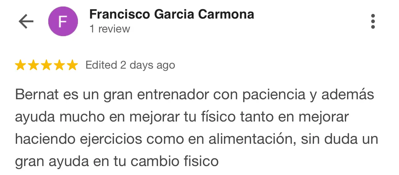 «Llevo tres meses muy intensos y llenos de aprendizaje. Si tienes dudas, da el paso: la inversión merece totalmente la pena. Bernat es muy profesional y sabe adaptarse a ti, incluso si llevas tiempo entrenando y crees que lo haces todo bien. Yo mismo tenía errores y aquí los he corregido, logrando avanzar más en poco tiempo. Las rutinas se adaptan a ti, y el acompañamiento es total. Lo recomiendo sin ninguna duda.»